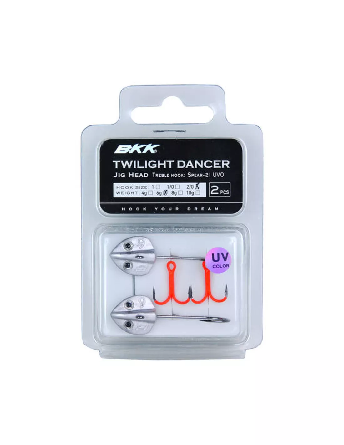 BKK Twilight Dancer jigkop. Het ontwerp en de zwemactie van de jigkop, al dan niet gecombineerd met de meegeleverde BKK UV-Dreg produceert een kunstaas dat het hele jaar door roofdieren aantrekt (voeg gewoon je favoriete jig toe als staart).Door de speciale vorm kan de Twilight Dancer ook perfect gebruikt worden voor het vissen op de “flats” voor bijvoorbeeld bonefish en snook. Verpakt per 2 stuks.
